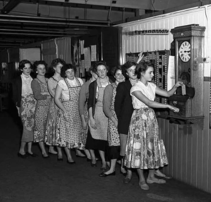 Personeel in de rij voor de prikklok. Tot medio 1970 een bekende aanblik. Personeel diende voor en na einde van de werktijd hun aanwezigheid te registreren door middel van 'de prikklok'. Een op naam staande kaart werd in de klok gestopt waardoor de tijd op de kaart werd weergegeven. Deze tijdregistratie was de basis waarop het loon/ het salaris werd berekend.